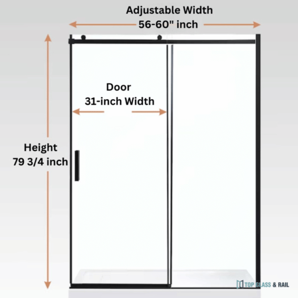 Dimensions and Finish: 56-60" inch Width adjustable x 79 3/4-inch Height, Door Width: 31-inch, Panel Width: 29 inch. The stainless-steel top guide bar can be trimmed up to 4 in. for width adjustment.